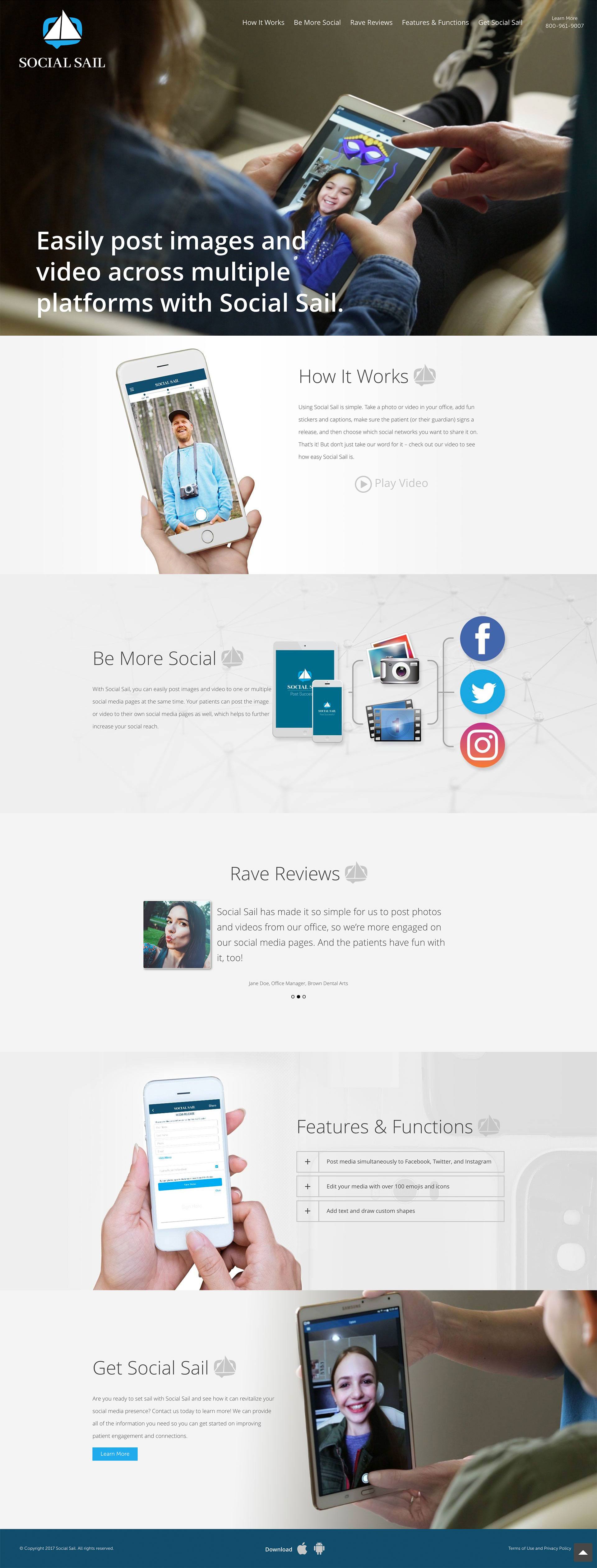 This is the landing page for the Social Sail app. I started with a wireframe of the main concept: a one-page landing page that we could use as a locus for PPC and Adwords campaigns.